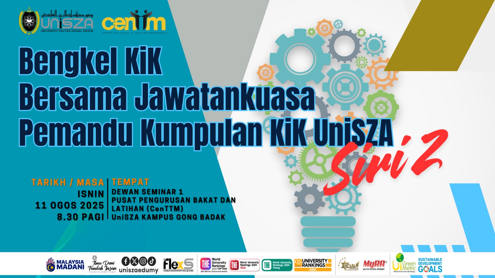 Sukacita dimaklumkan Pusat Pengurusan Bakat dan Latihan (CenTTM) akan menganjurkan Bengkel Kumpulan Inovatif dan Kreatif (KIK) Bersama Jawatankusa Pemandu Kumpulan KIK UniSZA Siri 2/2025 . Bengkel ini bertujuan untuk membuat semakan terhadap penyediaan projek KIK UniSZA dan membuat persediaan dokumentasi projek Kumpulan KIK UniSZA mengikut kriteria dan format yang ditetapkan bagi menyertai Konvensyen Kumpulan Inovatif dan Kreatif (KIK) Horizon Baharu Peringkat Universiti Awam (UA) Tahun 2026.