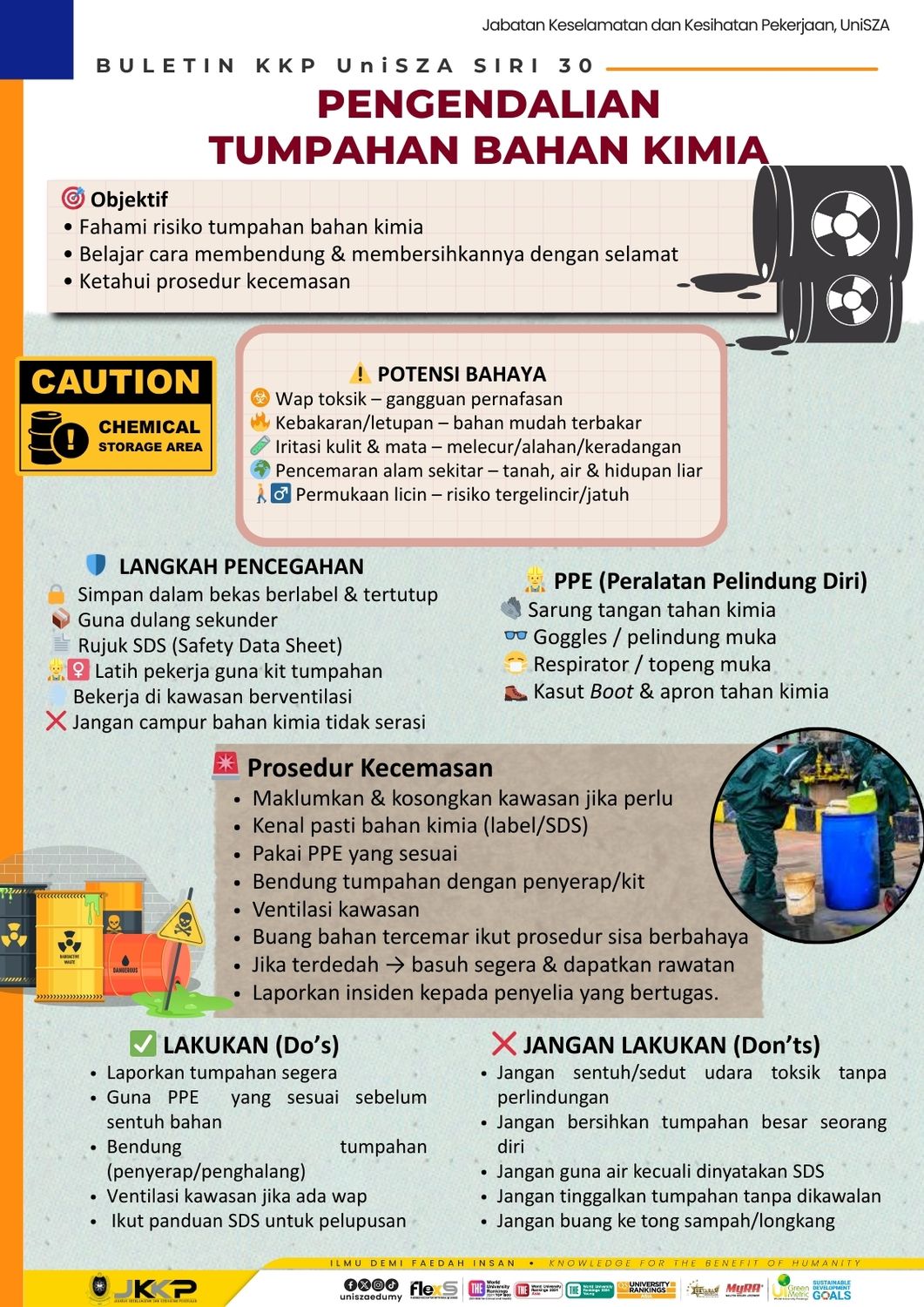 Sukacita dimaklumkan bahawa Bahagian Keselamatan dan Kesihatan Pekerjaan, Jabatan Keselamatan dan Kesihatan Pekerjaan (JKKP), UniSZA telah mengeluarkan Buletin Keselamatan dan Kesihatan Pekerjaan Siri 30 yang bertajuk "PENGENDALIAN TUMPAHAN BAHAN KIMIA".