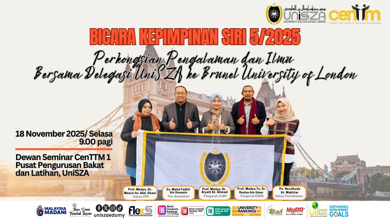 Sukacita dimaklumkan Pusat Pengurusan Bakat dan Latihan (CenTTM) akan menganjurkan Program Bicara Kepimpinan Siri 5: Perkongsian Pengalaman dan Ilmu Bersama Kumpulan UniSZA Ke Brunel University Of London. Program ini antara lain bertujuan untuk menggalakkan perkongsian ilmu dan refleksi kepimpinan berdasarkan pengalaman global UniSZA disamping berkongsi amalan terbaik serta nilai kepimpinan global yang releven untuk diterapkan dalam konteks pengurusan dan tadbir urus universiti.