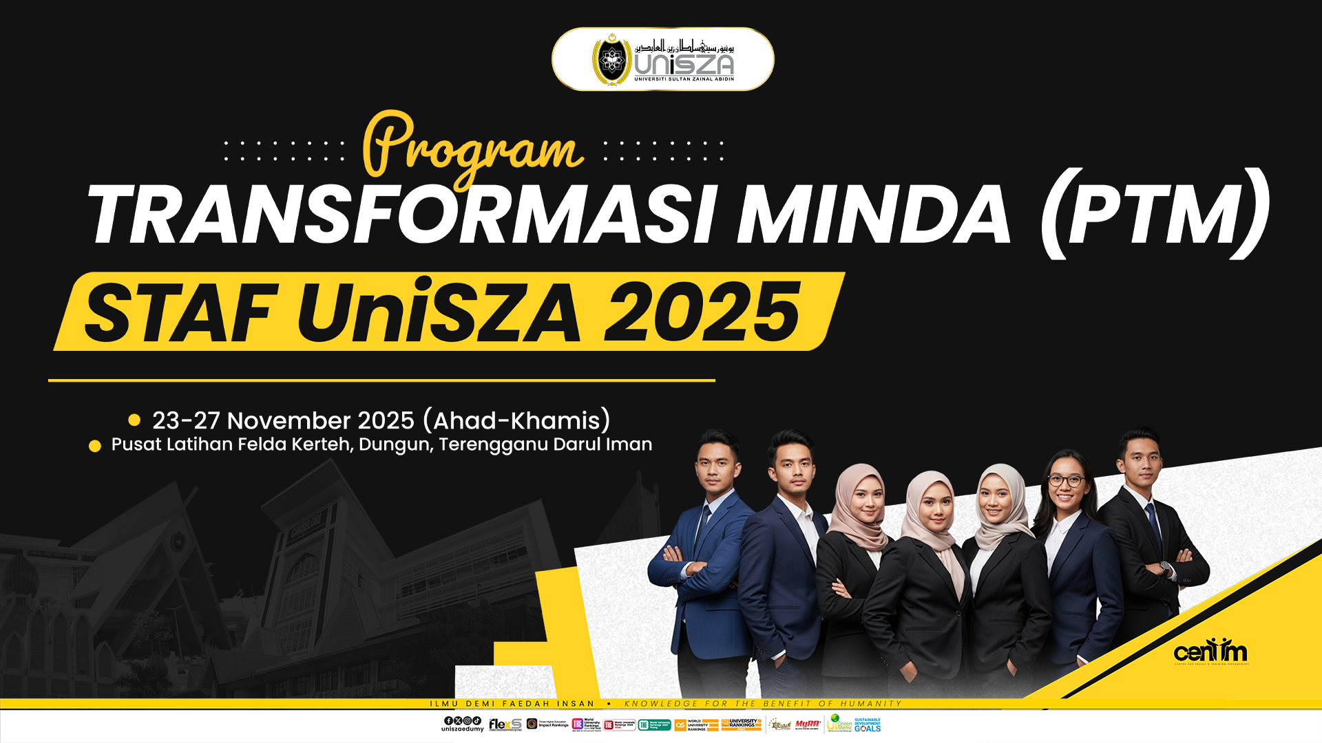 Sukacita dimaklumkan bahawa Pusat Pengurusan Bakat dan Latihan (CenTTM) dengan kerjasama Pejabat Pendaftar akan mengadakan Program Transformasi Minda (PTM) Staf UniSZA Tahun 2025 bagi tujuan pengesahan jawatan staf lantikan tetap dalam perkhidmatan awam di UniSZA.