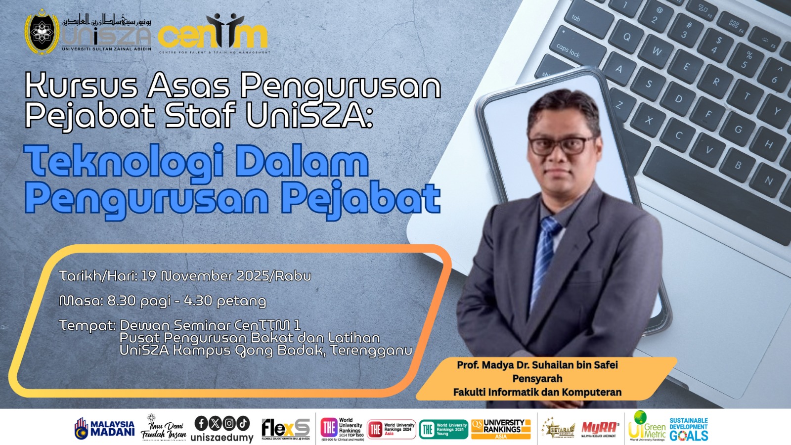 Sukacita dimaklumkan Pusat Pengurusan Bakat dan Latihan (CenTTM) akan menganjurkan Kursus Asas Pengurusan Pejabat Staf UniSZA : Teknologi Dalam Pengurusan Pejabat. Tujuan kursus ini adalah untuk memahami peranan teknologi dalam memodenkan pengurusan pejabat, menguasai penggunaan perisian pengurusan pejabat seperti Microsoft Office 365, Google Workspace dan aplikasi lain serta mempelajari teknik automasi tugas rutin untuk meningkatkan kecekapan kerja dalam mengurus dokumen digital secara berkesan.
