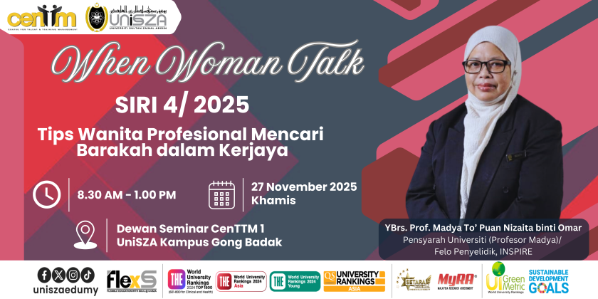 Sukacita dimaklumkan Pusat Pengurusan Bakat dan Latihan (CenTTM) akan menganjurkan Program Leadership When Woman Talk Siri 4: Tips Wanita Profesional Mencari Barakah Dalam Kerjaya. Program ini antara lain bertujuan untuk membentuk kefahaman tentang konsep barakah dalam pekerjaan bagaimana kejujuran, amanah dan niat yang betul membawa rezeki yang berkat.
