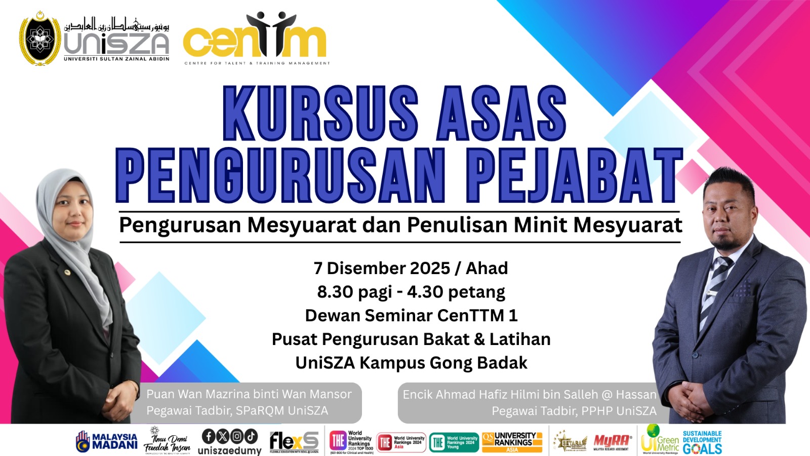 Sukacita dimaklumkan Pusat Pengurusan Bakat dan Latihan (CenTTM) akan menganjurkan Kursus Asas Pengurusan Pejabat Staf UniSZA : Pengurusan Mesyuarat dan Penulisan Minit Mesyuarat. Tujuan kursus ini adalah untuk memahami tujuan, kepentingan dan kompenan dalam pengurusan mesyuarat, membangunkan kemahiran dalam menguruskan mesyuarat yang efektif dan menerapkan kemahiran menulis minit yang jelas, ringkas dan tepat.
