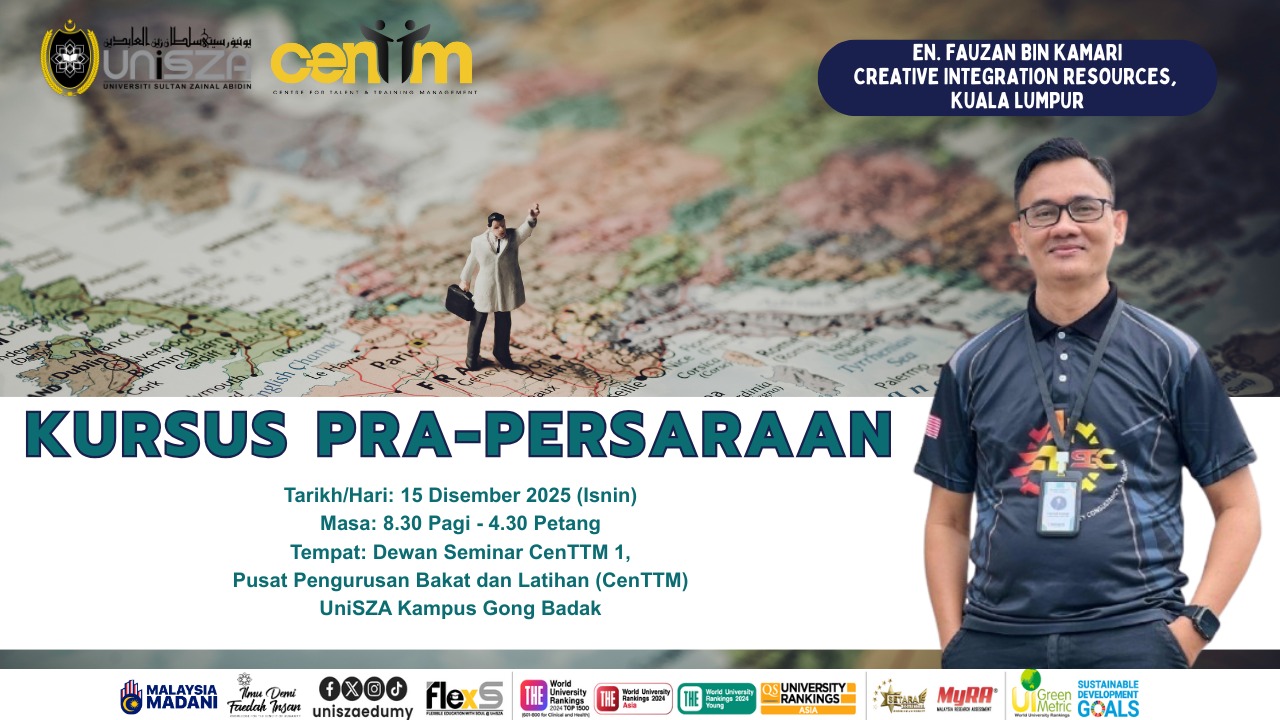Sukacita dimaklumkan bahawa Universiti Sultan Zainal Abidin (UniSZA) melalui Pusat Pengurusan Bakat dan Latihan (CenTTM) akan menganjurkan Kursus Pra Persaraan Staf UniSZA Tahun 2025. Program ini antara lain bertujuan meningkatkan kesedaran dan kesiapsiagaan peserta terhadap perubahan gaya hidup, peranan sosial dan tanggungjawab selepas bersara.
