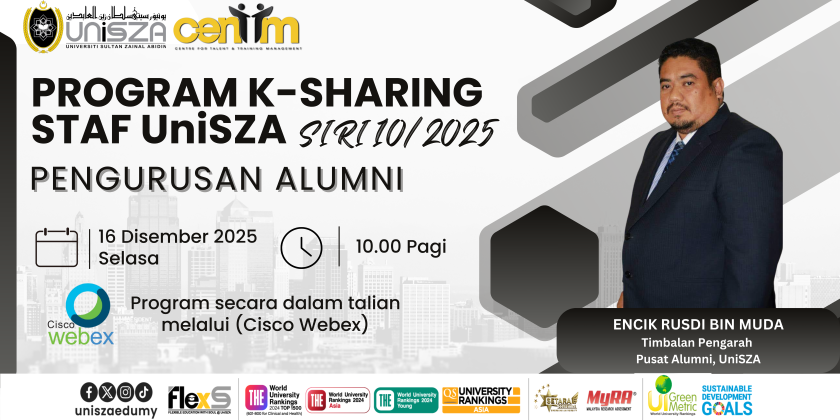 Sukacita dimaklumkan bahawa Pusat Pengurusan Bakat dan Latihan (CenTTM) akan mengadakan Program K-Sharing Staf UniSZA Siri 10/2025: Pengurusan Alumni. Program ini bertujuan untuk berkongsi maklumat berhubung Pengurusan Alumni bersama Warga UniSZA.